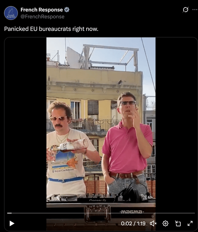 Internet memes are not only making the internet fun but they often act as a kind of distributed consensus mechanism for culture. And the current consensus is that Europe is finding its confidence (back) and with it it, a voice. Last week, the Italian duo Mind Enterprises, whose popularity has been steadily building over the past year, set the internet on fire by becoming the symbol of Europe’s response to the American “threat”.