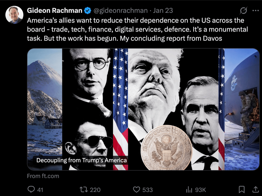 It’s the most visible signal of a shift in how Europe talks about itself and the new tone is a more confident one. Europe is falling in love with itself and its heritage again, not trying to respond to attacks but standing in its own right. We know what we’re capable of, we value what we have, and we’re ready to shape the future we want to see. When a German minister posts 'Europe for sure' riffing on the Macron Davos meme (the other internet sensation of last week), you know something is happening…